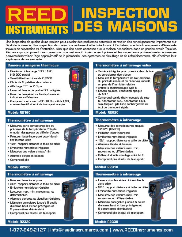REED Instruments propose des instruments de test de précision et de mesure de qualité pour aider les inspecteurs professionnels de maisons à révéler, le cas échéant, une isolation manquante, des problèmes avec le matériel CVCA ou l’écoulement de l’air, une mauvaise chaleur rayonnante, une toiture mal étanche et bien plus encore.