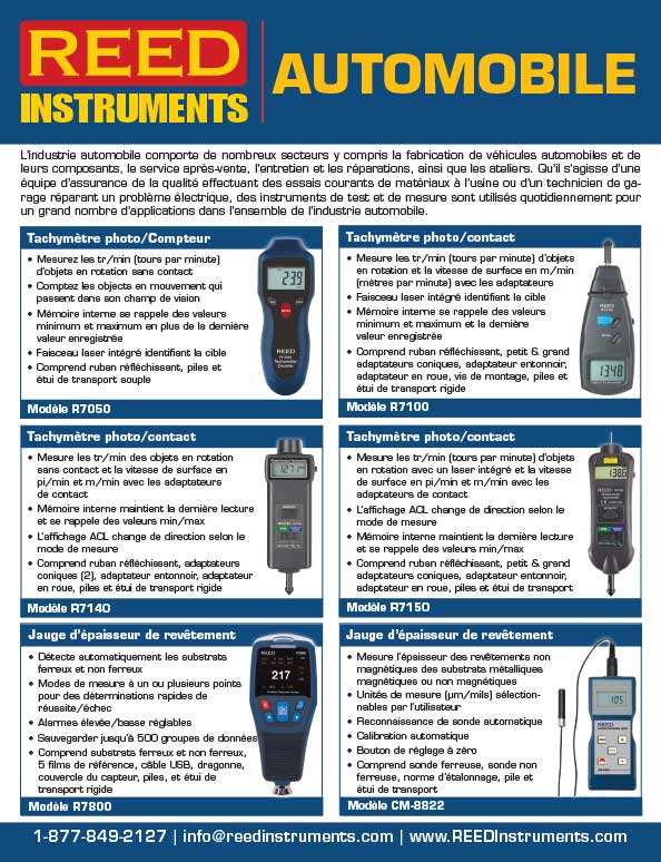 Les tachymètres peuvent aider à détecter des anomalies de vitesse rotative ou linéaire dans des courroies ou des moteurs, symptômes d’usure ou d’une défaillance imminente. Assurer la qualité du mélange d’un liquide de refroidissement (ou antigel) permet de prolonger la durée de vie du liquide et de celle du véhicule. Un réfractomètre est un outil permettant de vérifier la qualité du liquide de refroidissement d’un véhicule ou du liquide d’une batterie. Les jauges d’épaisseur de revêtement sont particulièrement adaptées pour vérifier le contrôle de la qualité dans les ateliers de réparation de carrosserie automobile pendant le processus de peinture, tandis qu’un endoscope vidéo peut être utilisé pour obtenir un accès libre autour des compartiments moteur exigus, des gaines et autres zones difficiles à atteindre derrière des moteurs ou des compresseurs. Des écarts de température peuvent indiquer l’existence de problèmes mécaniques ou électriques, y compris des problèmes de ratés du moteur, avec l’échappement ou les émissions, le circuit de refroidissement ou le chauffage et la climatisation. Diagnostiquez les écarts de température de manière rapide, sûre et facile grâce aux thermomètres avec ou sans contact de Reed Instruments.