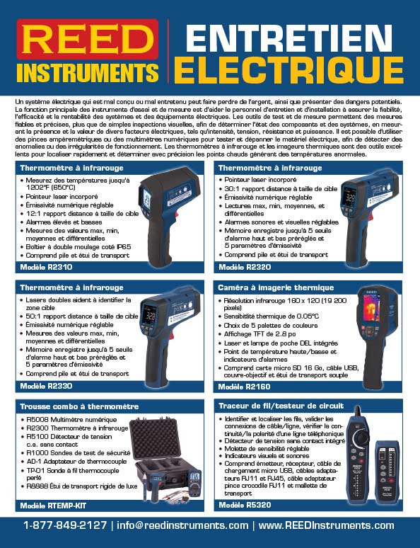Un système électrique qui est mal conçu ou mal entretenu peut faire perdre de l’argent, ainsi que présenter des dangers potentiels. La fonction principale des instruments d’essai et de mesure est d’aider le personnel d’entretien et d’installation à assurer la fiabilité, l’efficacité et la rentabilité des systèmes et des équipements électriques. Les outils de test et de mesure permettent des mesures fiables et précises, plus que de simples inspections visuelles, afin de déterminer l’état des composants et des systèmes, en mesurant la présence et la valeur de divers facteurs électriques, tels qu’intensité, tension, résistance et puissance. Il est possible d’utiliser des pinces ampèremétriques ou des multimètres numériques pour tester et dépanner le matériel électrique, afin de détecter des anomalies ou des irrégularités de fonctionnement. Les thermomètres à infrarouge et les imageurs thermiques sont des outils excellents pour localiser rapidement et déterminer avec précision les points chauds générant des températures anormales.