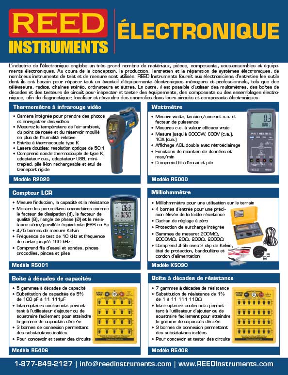 L’industrie de l’électronique englobe un très grand nombre de matériaux, pièces, composants, sous-ensembles et équipements électroniques. Au cours de la conception, la production, l’entretien et la réparation de systèmes électroniques, de nombreux instruments de test et de mesure sont utilisés. REED Instruments fournit aux électroniciens d’entretien les outils dont ils ont besoin pour réparer tout un éventail d’équipements électroniques ménagers et professionnels, tels que des téléviseurs, radios, chaînes stéréo, ordinateurs et autres. En outre, il est possible d’utiliser des multimètres, des boîtes de décades et des testeurs de circuit pour inspecter et tester des équipements, des composants ou des assemblages électroniques, afin de diagnostiquer, localiser et résoudre des anomalies dans leurs circuits et composants électroniques.