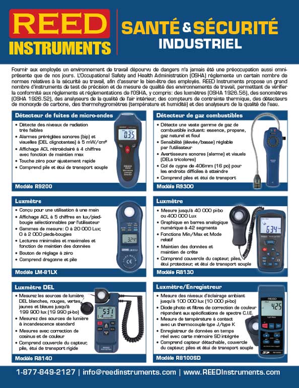 REED Instruments propose un grand nombre d’instruments de test de précision et de mesure de qualité des environnements de travail, permettant de vérifier la conformité aux règlements et réglementations de l’OSHA, y compris : des luxmètres (OSHA 1926.56), des sonomètres (OSHA 1926.52), des analyseurs de la qualité de l’air intérieur, des compteurs de contrainte thermique, des détecteurs de monoxyde de carbone, des thermohygromètres (température et humidité) et des analyseurs de la qualité de l’eau.
