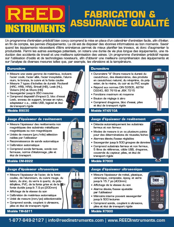 REED Instruments propose un grand nombre d’instruments de test de précision et de mesure de qualité utilisés par de nombreux services d’assurance qualité, y compris des dynamomètres, des jauges d’épaisseur, des duromètres, des thermomètres, des balances et des calibrateurs.