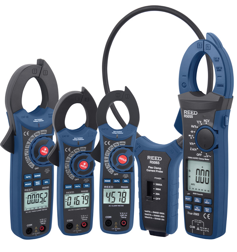 REED Instruments offers a wide variety of versatile Clamp Meters (also known as Clamp-on Meters and Current Clamps). REED clamp meters are used every day by industrial maintenance teams while performing scheduled and preventative maintenance on electro-mechanical equipment. Whether your application requires taking a quick one-time reading or you're looking for an industrial grade rugged instrument for everyday use, REED Instruments has great selection of reliable and accurate Clamp Meters to meet your job requirement.
