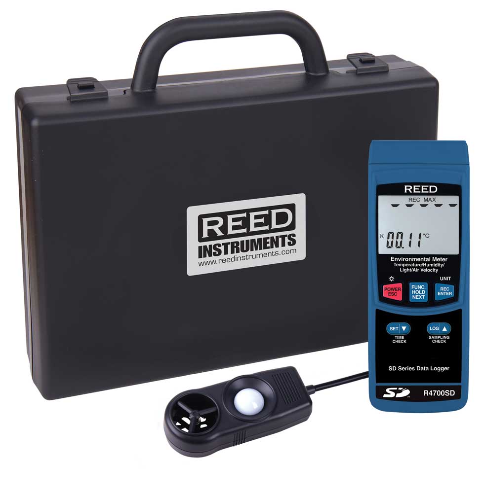 The R4700SD is a 6-in-1 environmental meter that measures air velocity, air temperature, ambient temperature, relative humidity, light and contact temperature measurements. Has the ability to capture sound level measurements using the R4700SD-SOUND adapter (optional). The R4700SD features Data hold, Max/Min functions, and an easy-to-read backlit LCD display. Using a SD card (max 16GB), a user can manually record up to 99 readings or automatically by selecting a desired sampling rate from 1 to 3600 seconds. Quickly generate an Excel file with raw data, all without the use of software. Optional accessories include a tripod and AC adapter for continuous long-term monitoring.