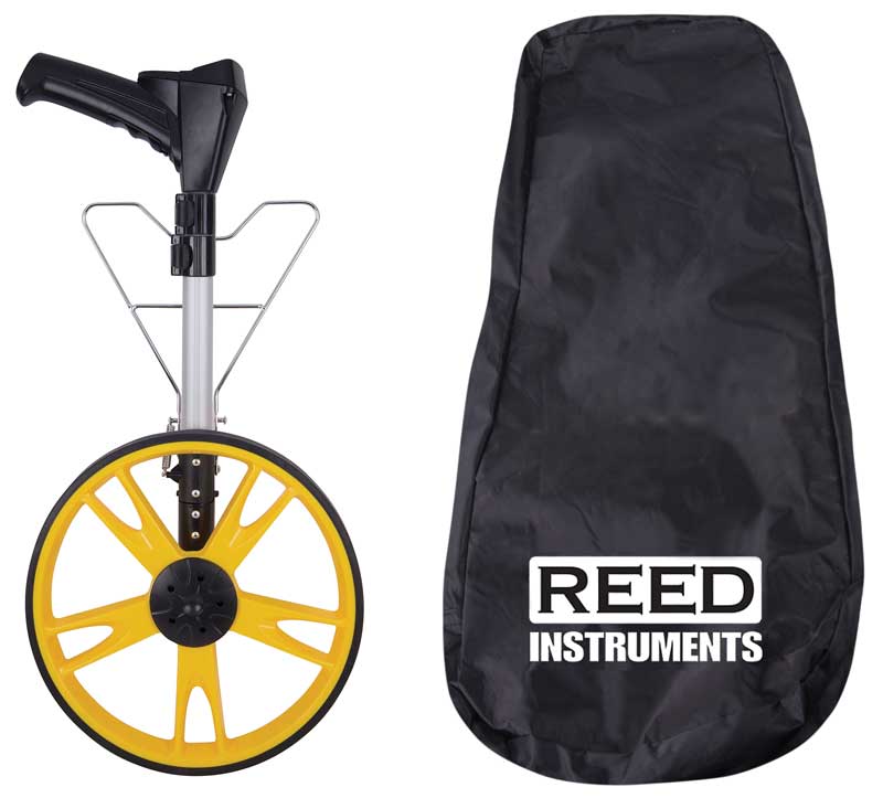 12.5" diameter measuring wheel designed for heavy duty professional use and features a telescopic handle for easy adjustment and internal memory to save measurements.